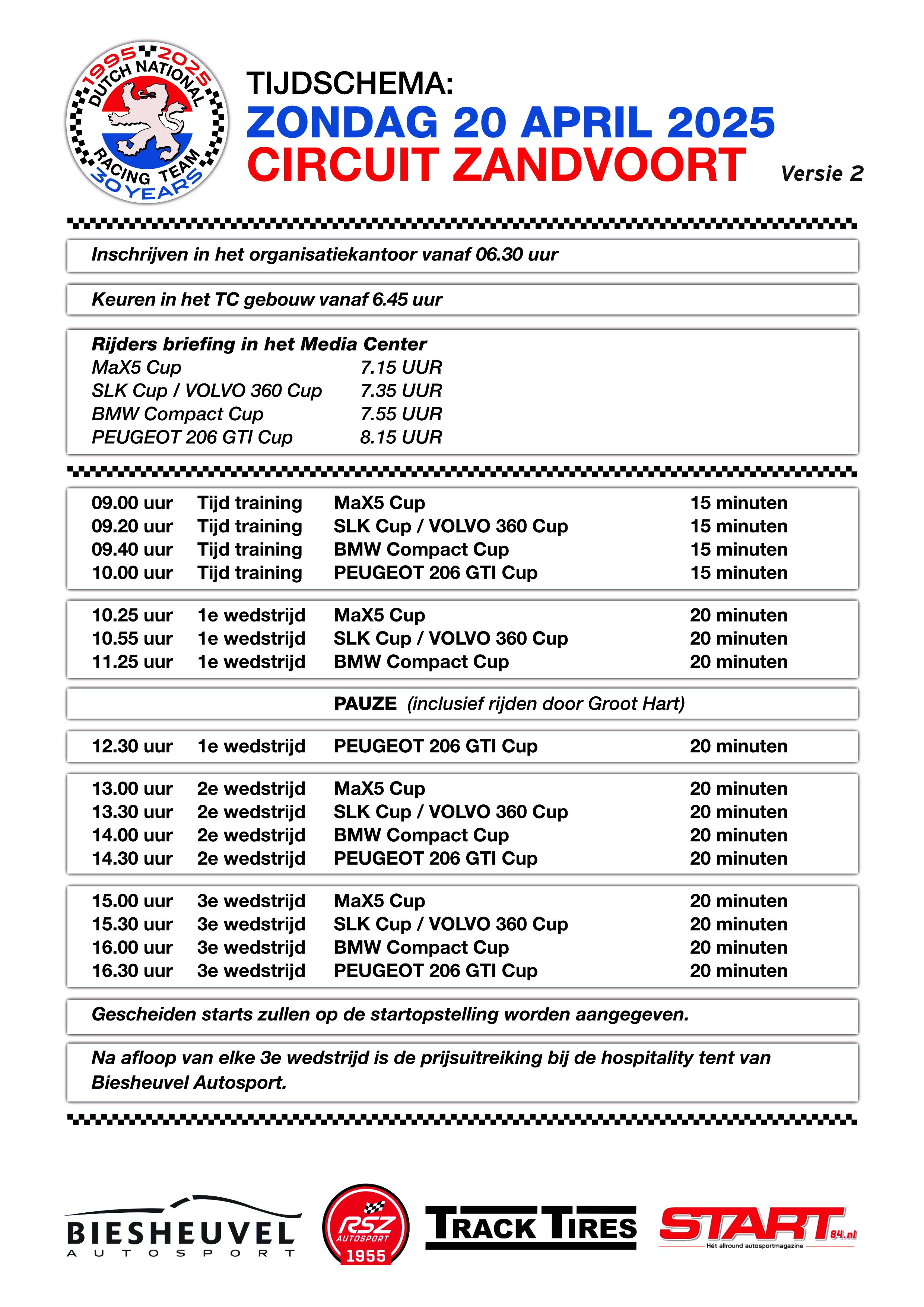 Bijgaand het tijdschema voor 3 april. Op vrijdagavond (2 april) willen we vanaf ongeveer 17.00 uur tot 19.00 uur vast gaan inschrijven in Paddock office, er kan dan ook worden gekeurd tot uiterlijk 19.30 uur. Houd er rekening mee dat de inschrijving bij de eerste race altijd iets langer duurt. Op zaterdagochtend beginnen we om 6.30 uur, met de inschrijving, deze inschrijving vindt ook plaats in Paddock Office. Je krijgt daar je keuringsbriefje alsmede een polsbandje, nadat je de vrijwaring hebt getekend.